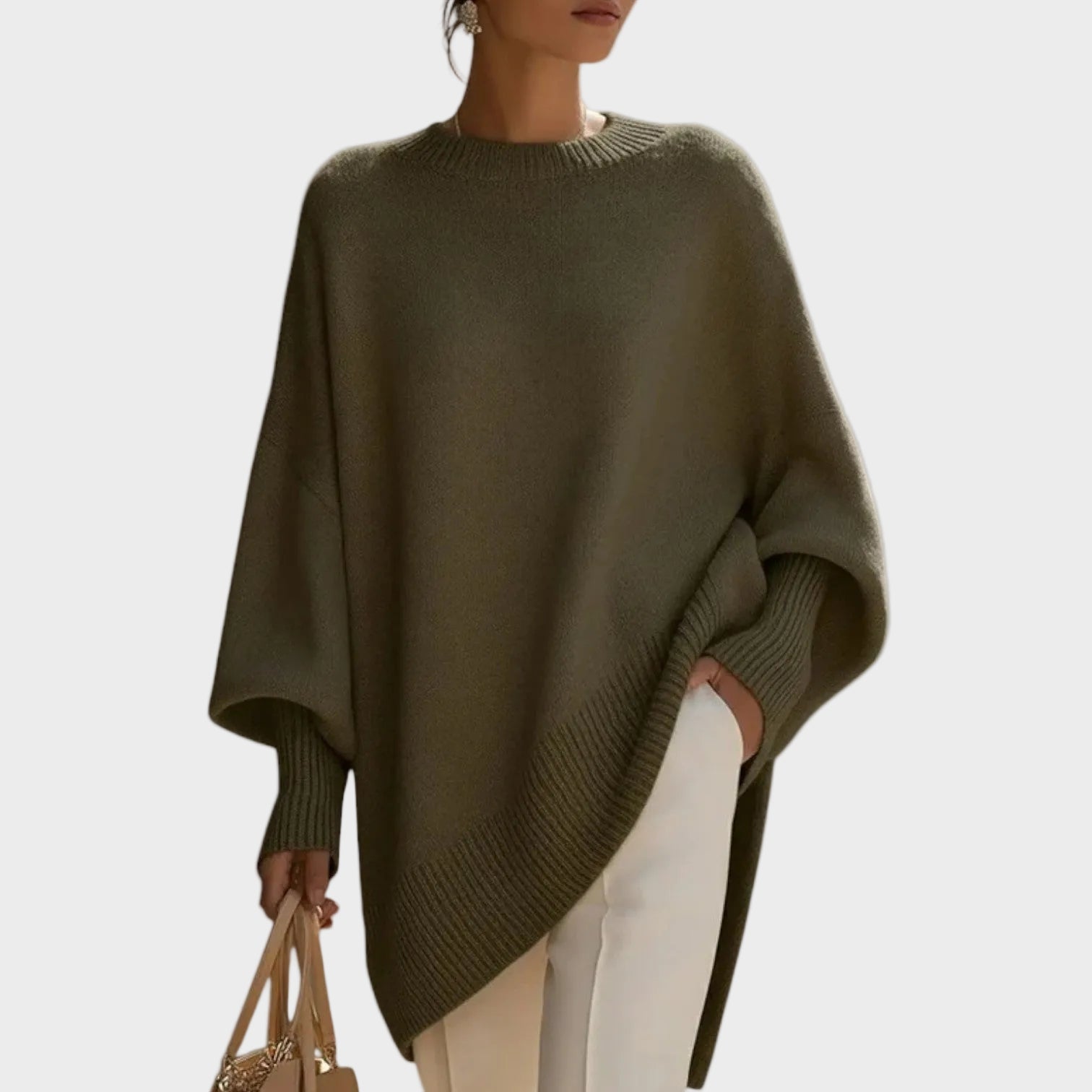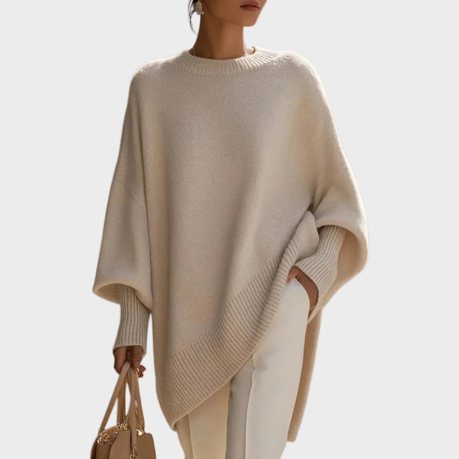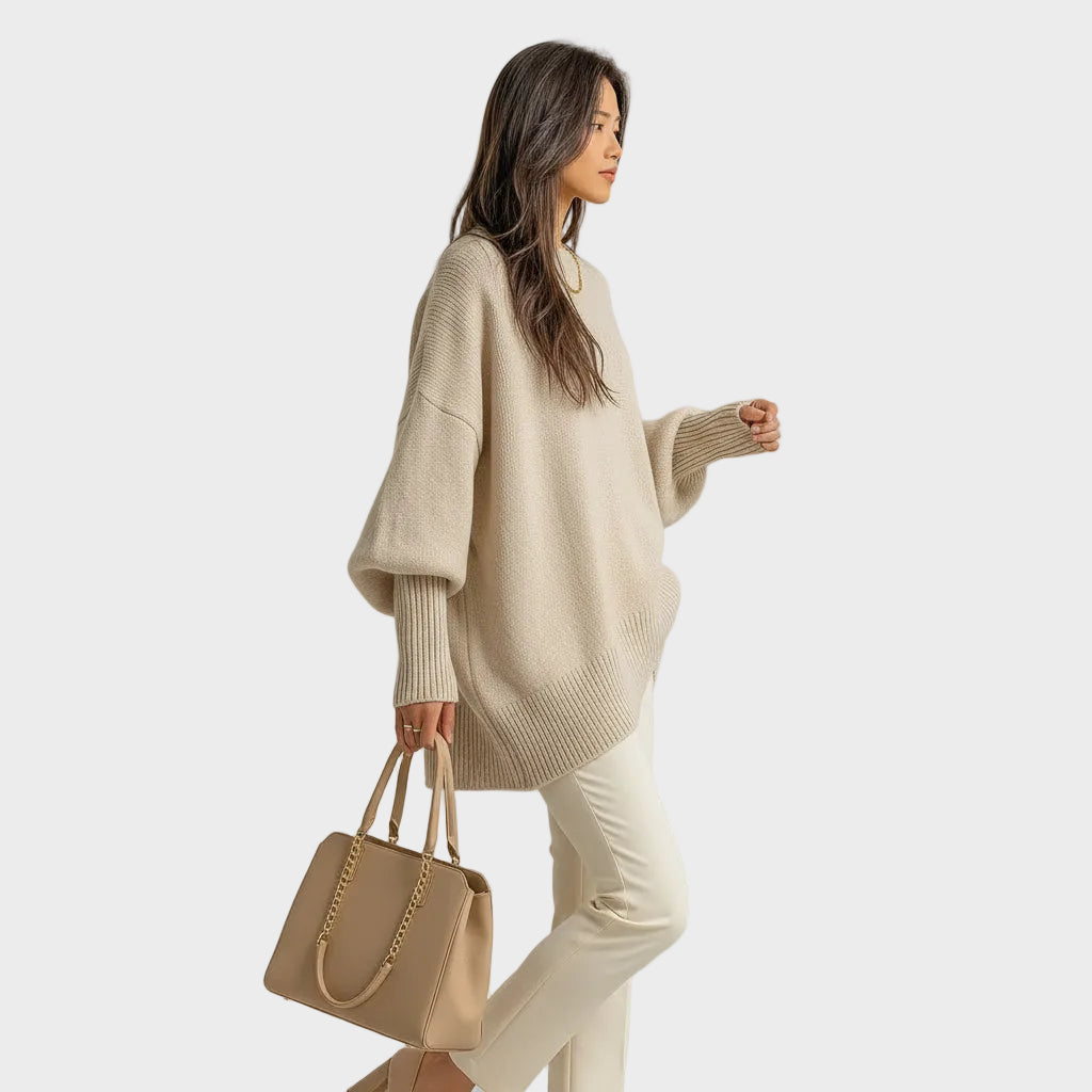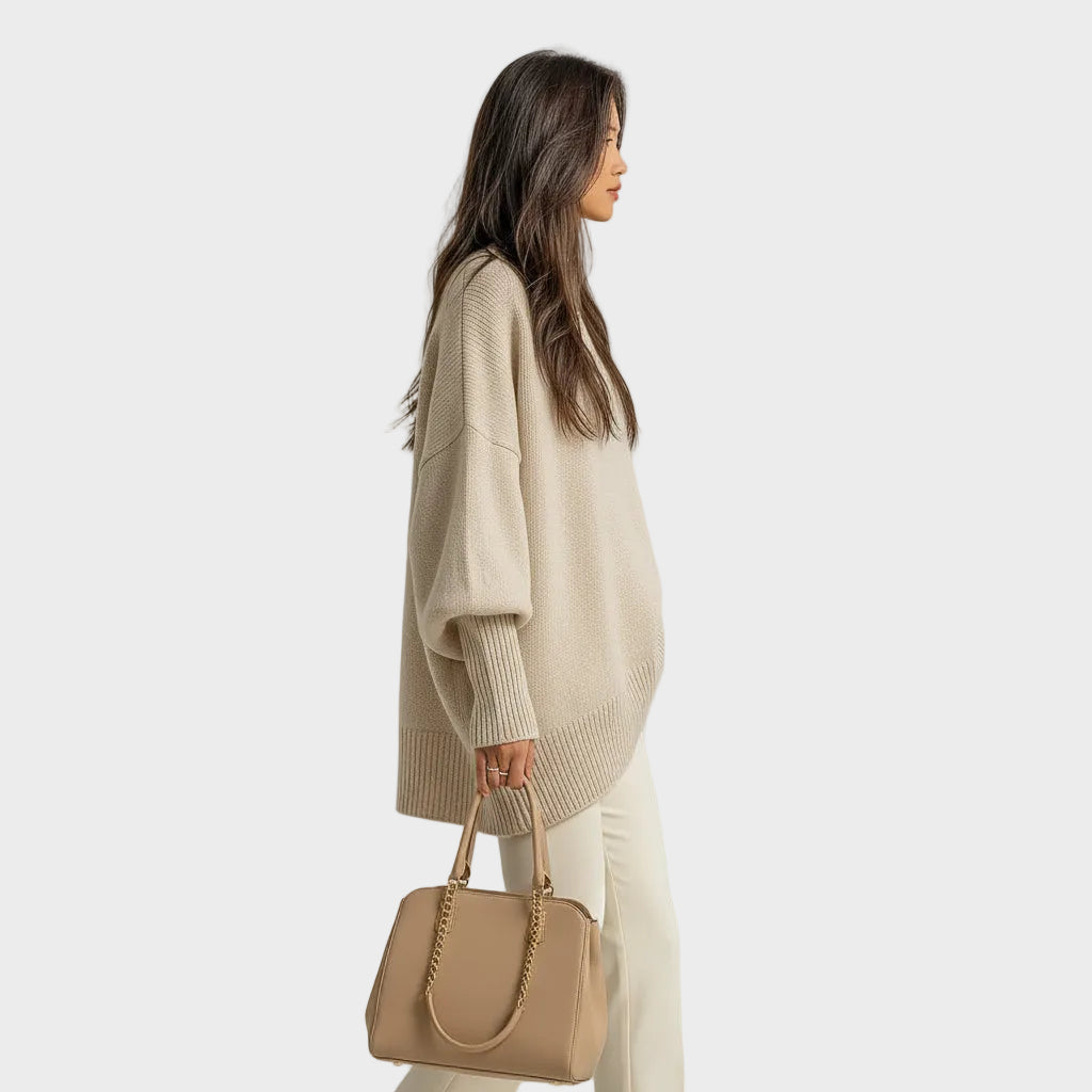 Fin teksturiran material in sproščen kroj puloverju dajejo umirjeno, moderno podobo. Tako nastane stilska celota, ki se počuti naravno in neopazno.