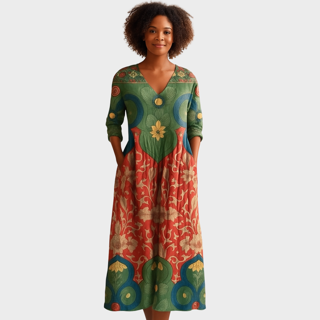 Odkrijte popolno ravnotežje umetniškega dizajna in udobja z našo etno maxi obleko. Z bogatim etno vzorcem, V-izrezom in praktičnimi žepi je ta obleka idealna za ženske, ki cenijo izvirnost in svobodo pri oblačenju. Lepršav kroj omogoča enostavno gibanje, medtem ko izraziti detajli dodajajo poseben čar vsakemu dogodku.