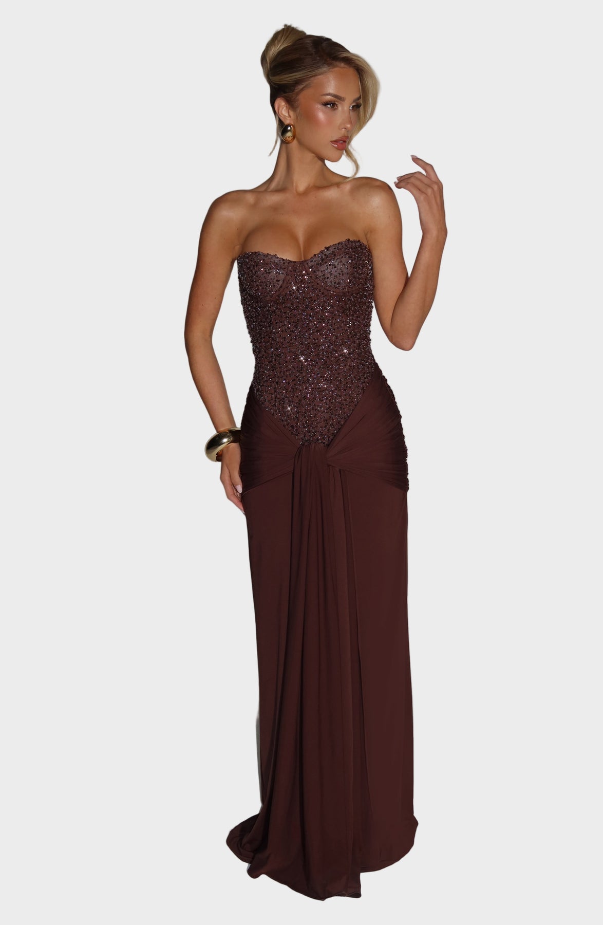 Odkrij Popolno Maksi Obleko, elegantno obleko, ki popolnoma poudari tvojo silhueto. Fin mrežast material z ročno izdelanimi detajli, ramena razkrivajoč dekolte in lahka, tekoča krila ustvarjajo luksuzen videz, poln samozavesti in klase.